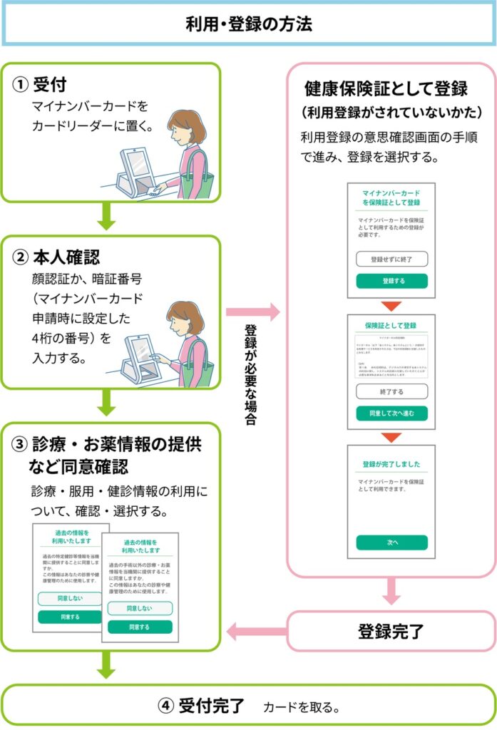 ※マイナンバーカードの健康保険証としての利用登録およびマイナンバーカードと保険証の連携はクリニックで行うことができます。利用のフロー図は以下の通りです。